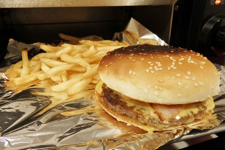 加熱時間を延長し過ぎてしまい、少々ハンバーガーの天面が焦げてしまいましたが、ハンバーガーはバンズもお肉も熱々でチーズもトロトロに。ポテトも揚げたてのようにカリカリです
