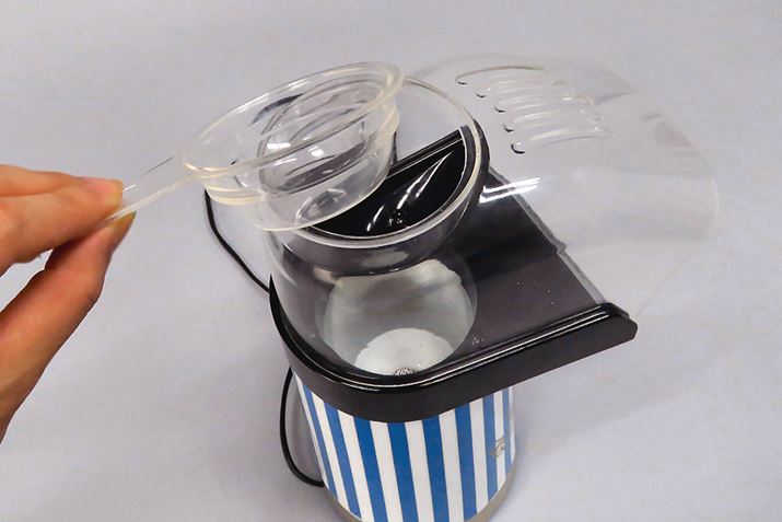 構造もシンプルですが、手順もシンプル。付属の計量カップで1杯分(最大量)のコーンを投入し、スイッチをオンにするだけ。できあがったらオフになるような機能はないので様子をみつつ行う必要はありますが、一定温度まで上昇すると自動でオフになる安全機能は装備されているので安心です。