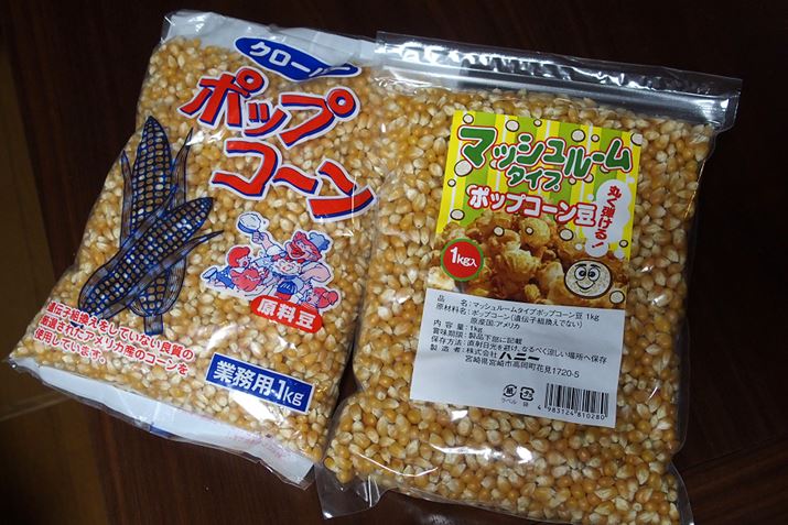 コーンはポップコーン専用のもの(爆裂種)を使用します。おなじみのバタフライ形のほか、最近よく見るマッシュルーム形の両方ともOK。筆者が購入したものは、1kgで1,000円程度