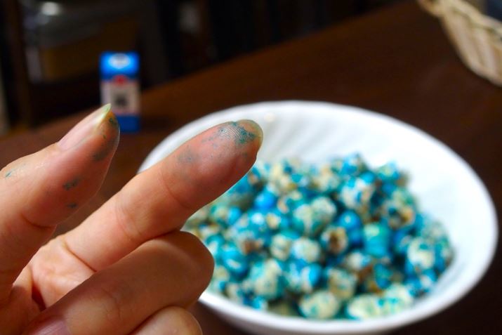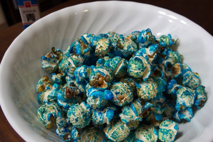 ハロウィンパーティーを意識して、ブルーの食紅で甘い系ポップコーンに仕上げてみましたが……手に付いてしまうのでちょっと失敗。口の中はお見せできない状態に(笑)