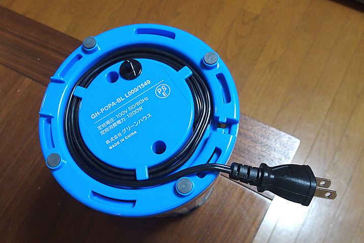 コードは底面の溝に巻きつけられるようになっていますが全部巻き取ることはできません。ナゼ? 惜しい! ちなみに、黒いポッチは転倒時時動作停止スイッチ。ちょっと傾けるとすぐに熱風が停止します