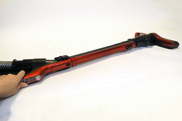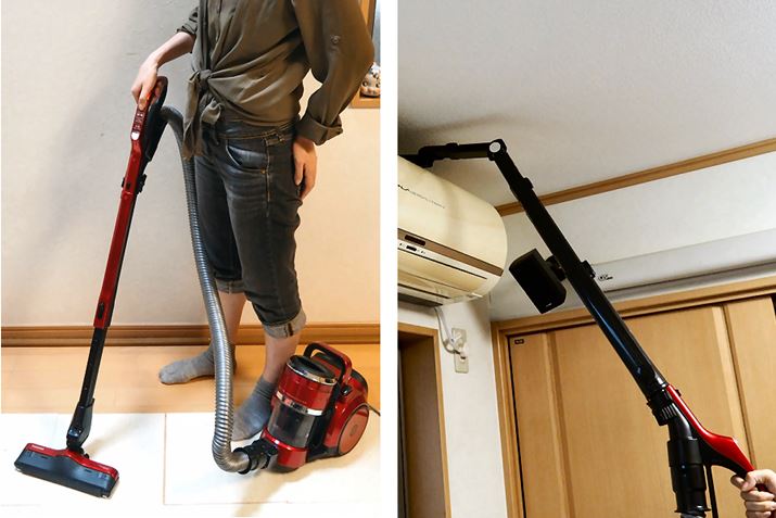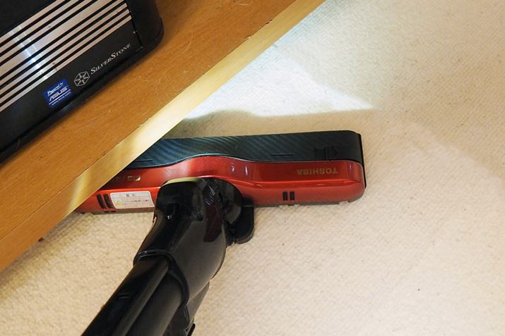 もう1つ便利と感じたのはヘッドの使いやすさ。グリップを軽く捻るとヘッドが左右に曲がり、簡単に蛇行できる。また、ハンドルを横に倒すことで、ノズルをほぼフラットに倒すことが可能。高さ約6.5cmまでの狭い隙間にヘッドが入り込む。