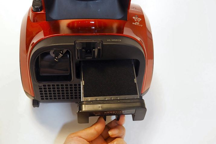 製品背部にはコード収納部と排気用のフィルターを格納。「お手入れサイン」が点灯したら、排気フィルターのホコリを落とす
