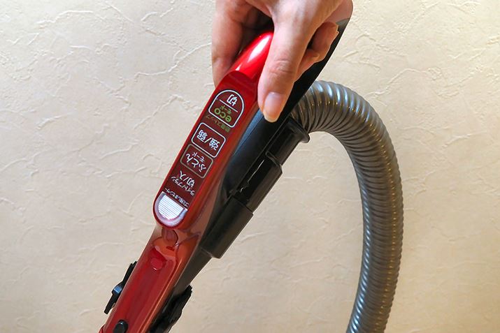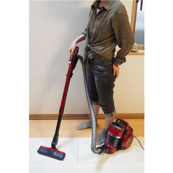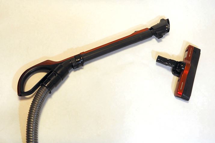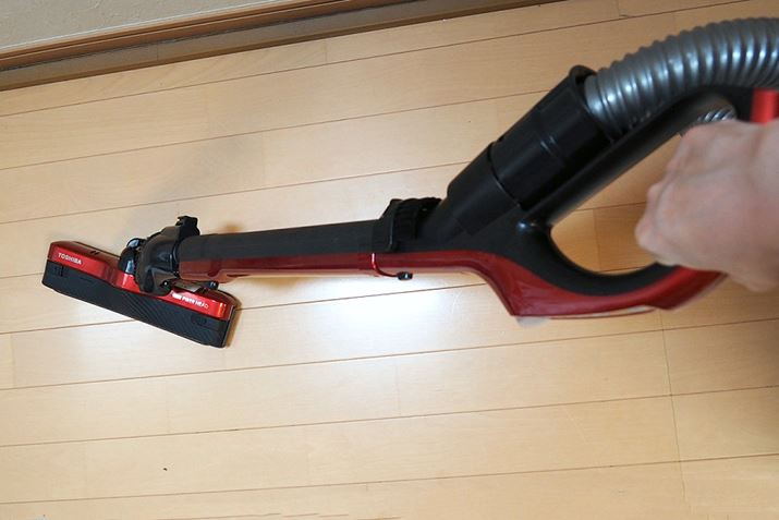 実際に床掃除をしてみると、その軽い操作感に驚く。筆者は最近コードレスクリーナーを使用することが多かったのだが、コードレスクリーナーはヘッドはもちろん、モーターやサイクロン部、ダストカップもすべて動かして使用する。このため、ヘッドが自動的に前進する「自走式」でも、手にはそれなりの負荷がかかる上、左右にヘッドを振る際にも少し力を必用とする。しかし、キャニスター式のVC-MG910は、手にかかる負荷はヘッドとホース部の約1.4kg分。そのうえ、自走式ヘッドも採用しているのでほとんど力を必用としない。また、軽い力で左右へ曲がる。あまりの使用感の軽さに、最初は「きちんと汚れを吸い込んでいるのか?」と不安になったが、カーペットにへばりついた犬の毛などもキッチリ掃除してくれていて驚いた。ちなみに、運転音も64dB程度と比較的静か。さすがに横でテレビを観るにはうるさいが、今まで使用していたDC36の音と比べるとビックリするくらい静かと感じる。