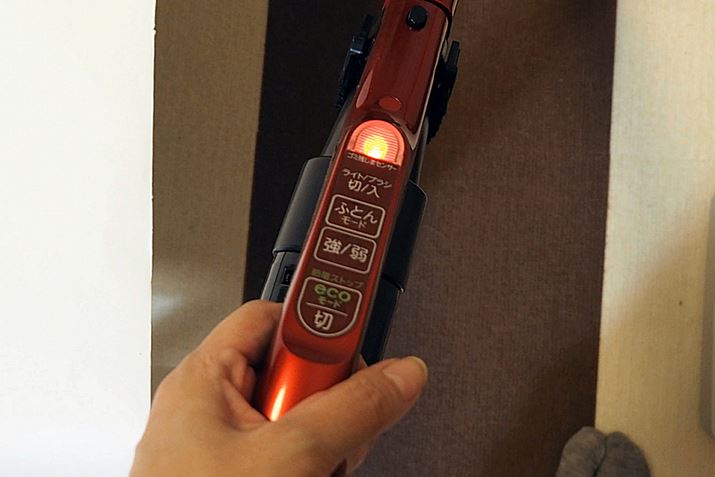 真上からも、横からも握れるグリップも使いやすい。ハンドル部には「ecoモード/切」ボタンのほか、強弱モード、ふとんモード、そしてライトとブラシのon/off切り替え用ボタンが配置されている