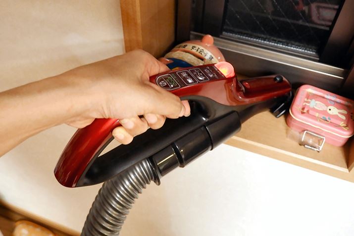 また、ハンドルの先にブラシが格納されており、さらに延長ホース先にも2つめのブラシがある。このため「棚の上や隙間を掃除したいな」と思ったときに、わざわざ付属ブラシにとりかえることなく、棚の上や狭い場所をササっと掃除できるのも便利に感じた。