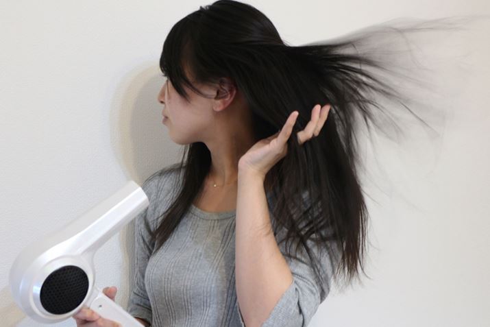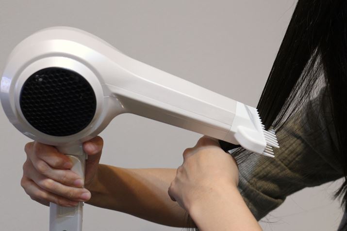 「イオン ラピッド」に比べて風圧が弱いため、髪は根元と毛先の中間から舞い上がっています