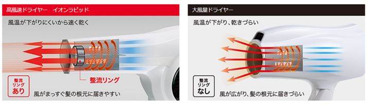 吹き出し口手前に搭載された「整流リング」によって風の広がりを抑え、頭皮までまっすぐ届けます※画像はメーカーサイトより