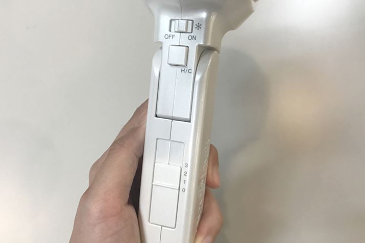 モード選択を行う電源スイッチは、手の感覚だけでも操作しやすいスライド式です。電源スイッチの上には、マイナスイオン放出機能のオン/オフの設定ボタン。風温(温/冷)はその下のボタンで選択します