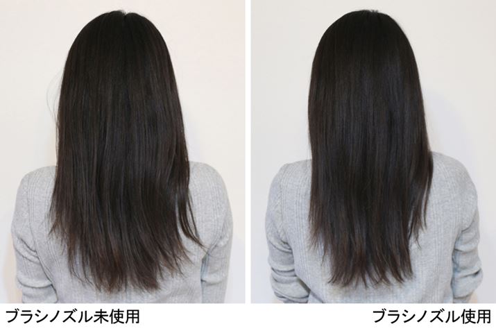 ヘアドライの終盤にブラシノズルを使用するだけで、仕上がりのまとまり感にかなり差が出ます。写真では伝わりにくいですが、ブラシノズルを使用したほう(右)は、手触りもさらさらです