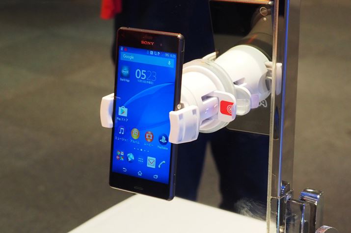 付属のスマートフォンホルダー。底部は強力な吸盤になっており、鏡などに装着して使用する