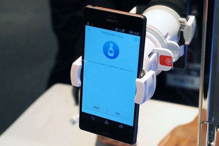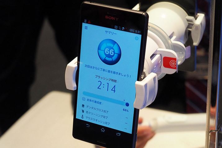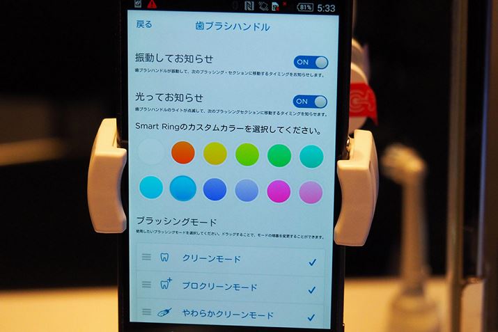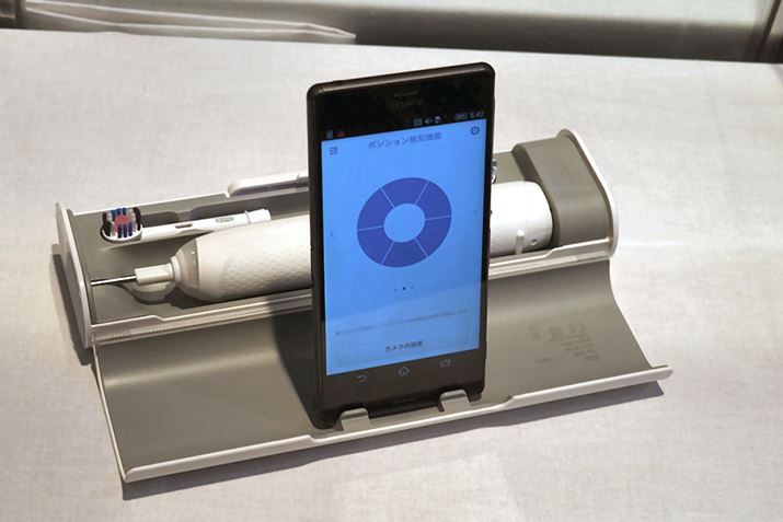 ジーニアス9000の最大の特徴は、この最後の「口内全体を均等に磨く」を実現するために世界初の「ポジション検知機能」を搭載している点だ。ポジション検知機能とは、ジーニアス9000本体内に内蔵されたモーションセンサーと、スマートフォン用専用アプリのカメラ機能の2つのセンサーで、リアルタイムに「どこの歯を磨いているか」を検知する機能。使い方は、鏡などに付属するスマートフォン用のホルダーを吸盤で貼り付け、専用アプリを起動。カメラの位置を顔に合わせてスタートするだけである。