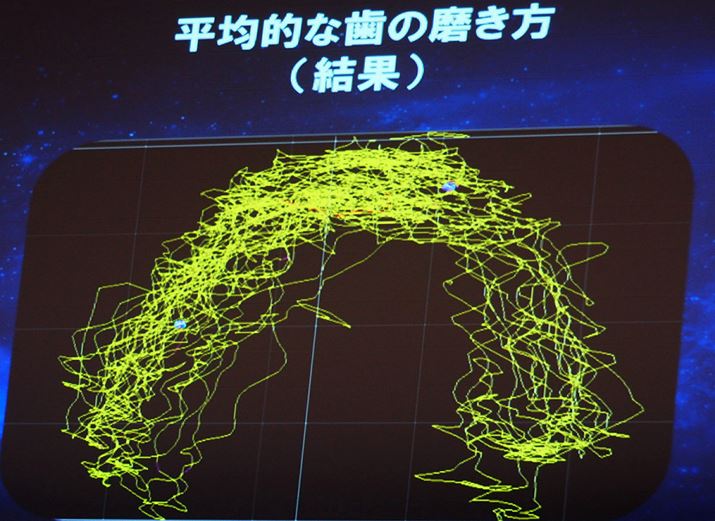 右利きの平均的な「みがき方」をトラッキングした図。左奥歯は均一に磨けているものの、前歯は磨きすぎ。そして右奥歯は磨く回数が極端に少ないのがわかる