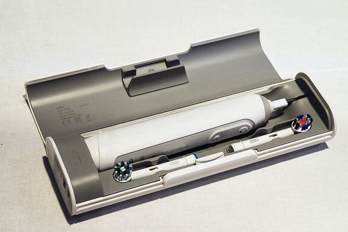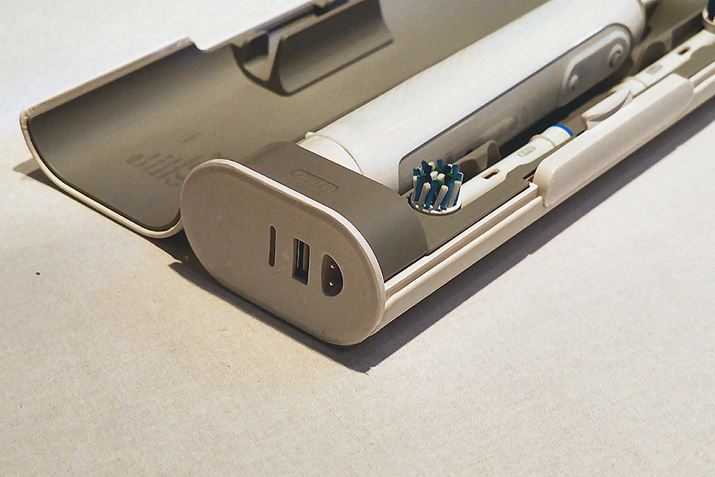 ジーニアス9000とブラシを収納できるトラベルケース。フタ部分の凹凸にはスマートフォンを挿し込むことが可能。簡易スマートフォンホルダーとしても使用できる