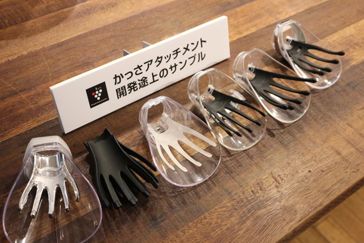 「かっさアタッチメント」が完成するまでに作成したサンプルも展示されていました。頭皮に当たる部分の素材の弾力性など、試行錯誤を重ねて最適のものを採用したそう