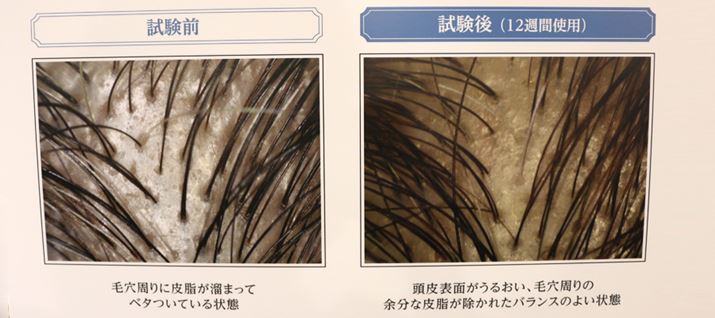 プラズマクラスターでケアした頭皮(右)は、うるおいが保たれることにより、毛穴周りの余分な皮脂が除かれて、バランスのよい状態になっていることがわかります