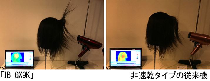 上の写真では、「IB-GX9K」の風を当てたヘッド(左)の表面温度が、非速乾タイプの従来機の風を当てたヘッド(右)よりも低いことがわかります。髪の舞い上がり方も、「IB-GX9K」のほうが激しい!