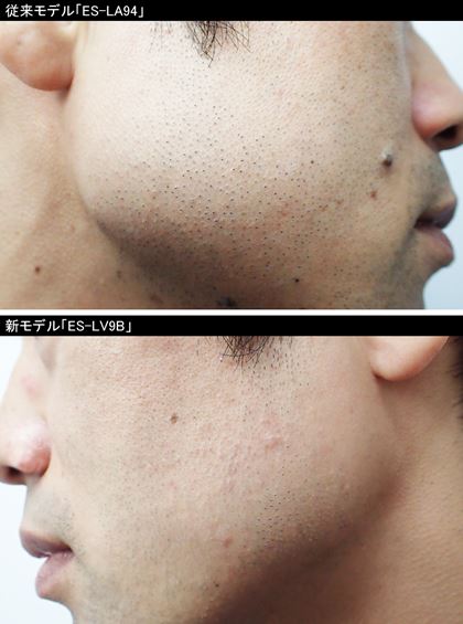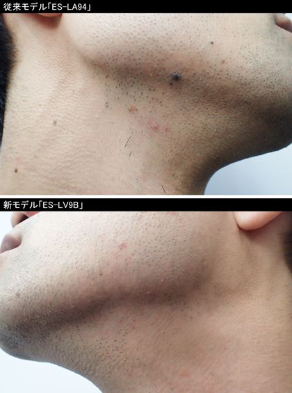 筆者愛用のES-LA94で剃った頬はヒゲの黒いポツポツが目立つのに対し、新モデルでシェービングしたほうはものすごく薄い。つまり、これが深剃りの差ということなのでしょう。ここまで剃れても、肌はヒリヒリしません