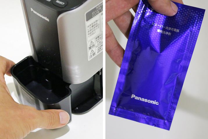 シェーバーの性能を保つためには、使用後の手入れが大切。ES-LV9Bには充電台を兼ねた洗浄器が同梱されており、専用の洗浄剤を入れておけば、洗浄〜乾燥まで実行してくれます。洗浄剤を使うタイプのものは洗浄器のサイズが大きくなる傾向にありますが、ES-LV9Bの洗浄器は主要メーカーの中でも小さめ。また、洗浄剤が1箱(3袋入り)1,000円程度という価格も魅力です。1袋で約30回は洗浄できるそうなので、コストはそれほど負担にはならないでしょう。他社の洗浄剤は高いもので1つ(30回洗浄可能)700円ほどするものもあるので、比較的ローコストと言えるのではないでしょうか。なお、洗浄剤の内容はアルコール洗浄など、メーカーでさまざま。除菌効果に違いがあるので低価格であればいいというわけではありませんが、選びの際の参考にしてください。