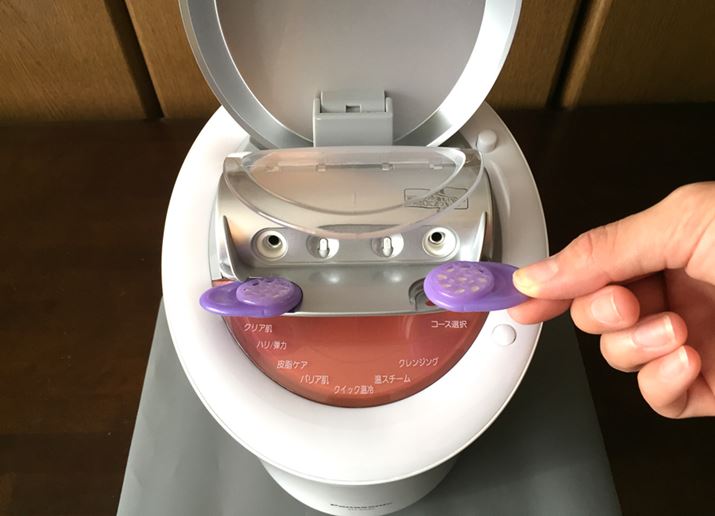 自動温冷コースは5つあるので、その日の肌の調子や気分にあわせて選択できるのもいいですね。使用するにあたり、ただじっとスチームとミストを浴び続けることが退屈になりそうな人には、「マッサージ」などとあわせた“ながら使い”をおすすめします。筆者も、最長13分のコースでケア中、特に温スチームを浴びている時間をもてあましてしまいました。もちろん温かくて気持ちいいのですが、6分間動けないのは、せっかち者にとっては厳しいのです。そんな時に、別売りのアロマタブレットの香りでリラックスしたり、マッサージをしたりすることで、時間を有意義に過ごせました。また、「クレンジングコース」と「温スチーム単独コース」は日々の簡単ケアとしてかなり使えるので活躍しそうです。