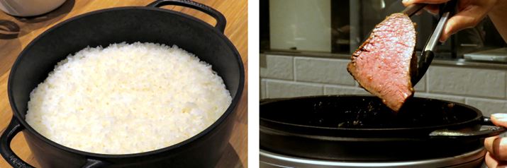 「世界一おいしいご飯が炊ける」をうたう本製品。本当に旨みたっぷりで美味しい! ちなみに保温機能はないですが、保温用内ブタがないほうがご飯は美味しく炊けるそう。IHヒーターで鍋底を均一に加熱できるから、ローストビーフもムラのない均一な焼きあがり。内側は理想的ピンク色。火加減の妙がなせるワザですね