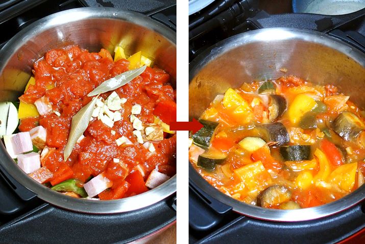 煮崩れせず、でも、味はしっかり染み込んだラタトイュ。普通の鍋で作るにはまぜたり火の調整も必要ですが、ホットクックなら全自動! 無水調理だから濃厚なスープがたっぷり!