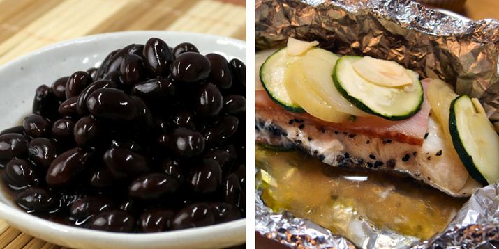 左は、「温度」+「一定圧力」+「温度」調理で作った「黒豆煮」(調理時間:5時間半)。シワもよらずふっくら! 右は「一定圧力」調理で作った「たらの洋風重ね蒸し」(調理時間:25分)。崩れやすい白身魚がそのままの形で美しく仕上がっています