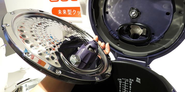 フタ部分に装着されている「まぜ技ユニット」。ユニット内の負荷センサーと鍋本体に搭載された各種センサーの情報により自動調整され、最適なタイミングと回転速度で鍋内の具材を攪拌