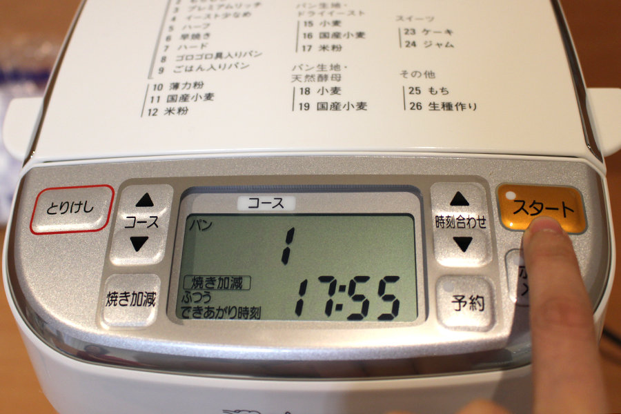 ここからはもうラストスパートです。本体の電源プラグをコンセントに差し込むと、自動で電源がONになります。本体上面のモニターに調理コースが表示されるので、矢印のついた「コース」ボタンを押して使うコースを選びます。今回は番号「10」の「食パン・ドライイースト『薄力粉』」コースを選択。そして最後に「スタートボタン」を押します。