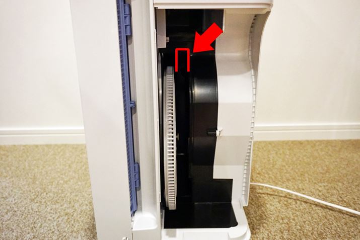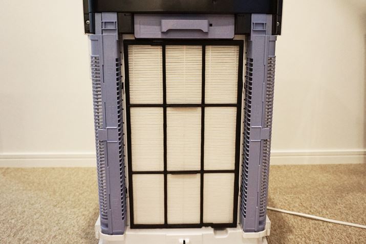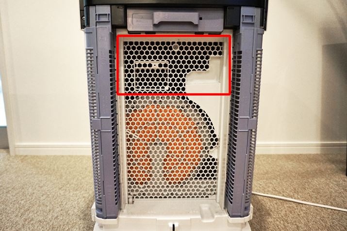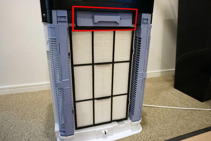 わかりやすいように水トレーを外していますが、加湿フィルターと空気清浄機の間にはすき間が設けられています。この部分で加湿フィルターを通った空気ともう1つの風路から来た空気が混ざり、“冷た過ぎない温度”で放出。ダイキンの加湿空気清浄機は大きいと言われますが、性能を保持するために譲れない部分なのでしょうね