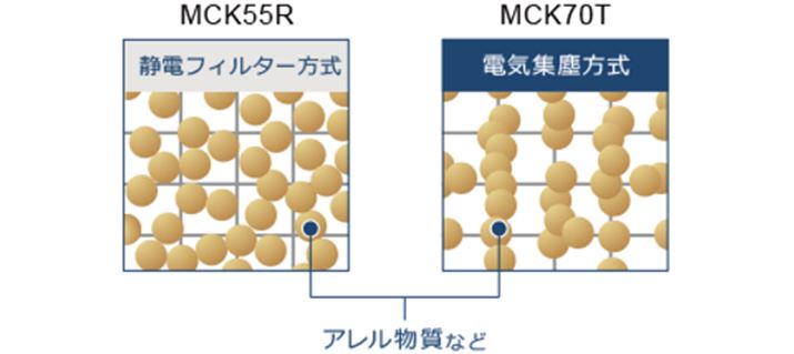 空気清浄機内部で有害化学物質に効果を発揮するストリーマですが、MCK70Tにはもうひとつの分解方法が搭載されています。それが、イオンを空気中に放出する「アクティブプラズマイオン」。ただし、アクティブプラズマイオンは空気清浄機で吸い込めない、ソファやカーテンなどに付着したニオイを除去するためのものだそう。カビや菌、ウイルスといった汚れは電気集塵方式でキャッチし、ストリーマで分解するのがメインです。