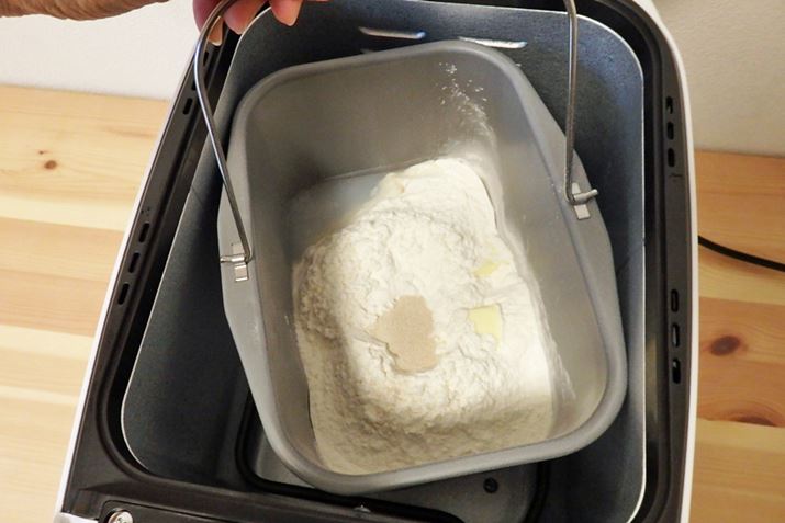 材料(強力粉、砂糖、塩、バター、スキムミルク、水)をパンケースに投入。ドライイーストの自動投入機能はないため、ほかの材料と一緒に入れます