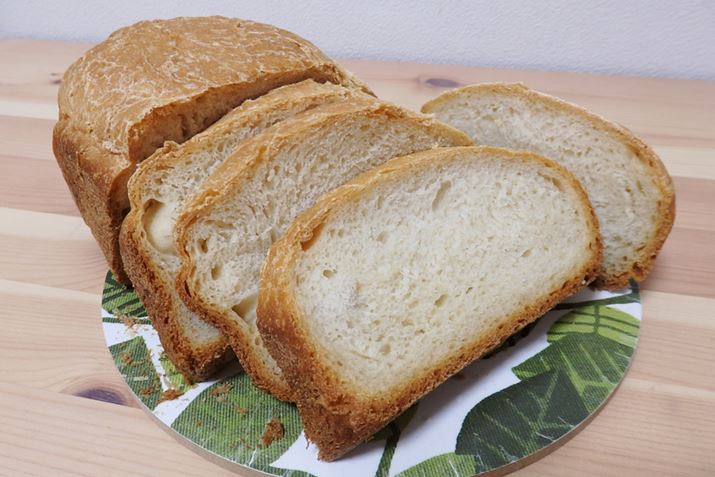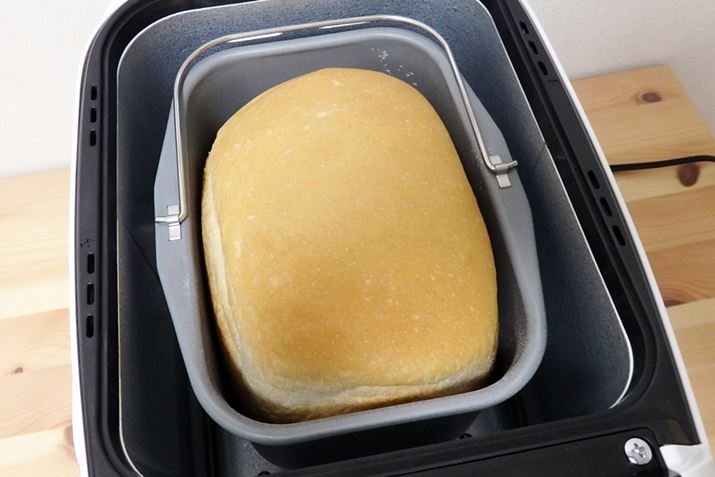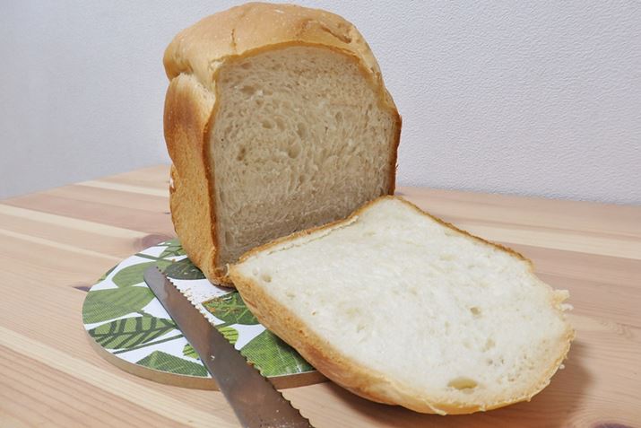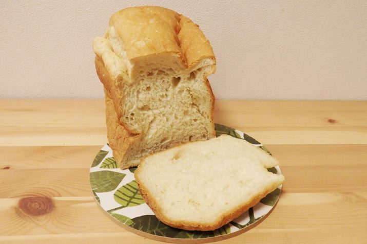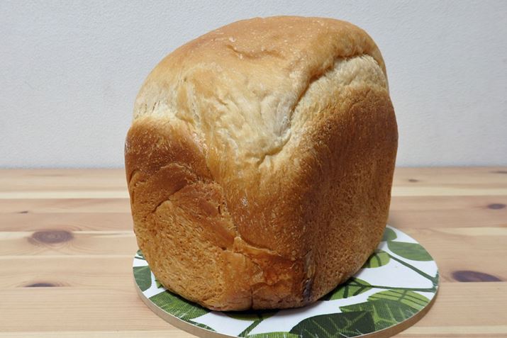 天面も側面もきれいなキツネ色がついており、見るからにおいしそう。本体に窓のあるホームベーカリーは天面の焼き色が薄くなりやすいので、この仕上がりは見事