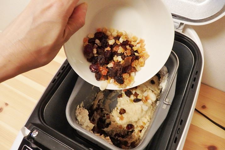運転を始めて約9分後に、生地に練り込む具材を入れる合図が鳴ります。自動で具材を投入してくれる機構も搭載されていないので、手動。レーズンやフルーツミックス、アーモンドなどを投入しましょう