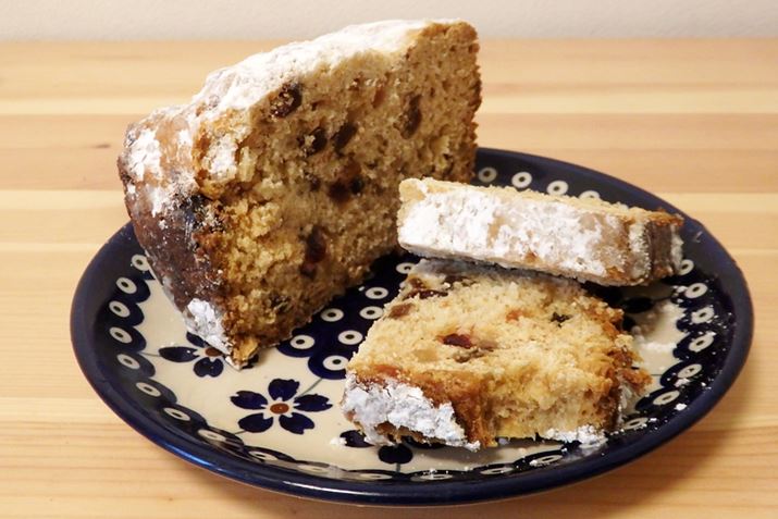 焼きあがったシュトーレンに溶かしバターを塗り、粉砂糖をふりかければ完成です。成形の手間がないのがいいですね。出来たてのふわふわ感を楽しむもよし! 冷蔵庫に入れて、バターやドライフルーツのうまみがどんどん凝縮さていくのを堪能するもよし!