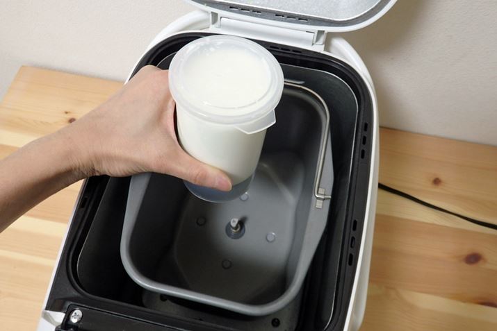 付属の容器に牛乳200mlとヨーグルト20gを入れ、羽根を外したパンケースにセット