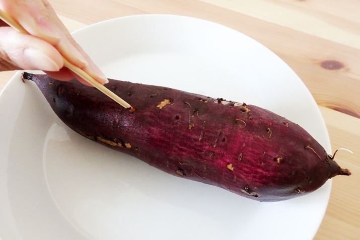 さつまいもに竹串などを使って3cm間隔で穴をあけます。全体に均一にあけるのは、少々手間