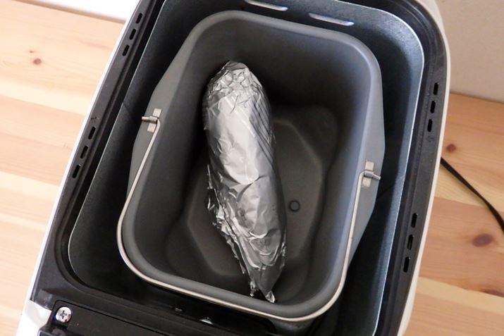 アルミホイルでさつまいもを包み、羽根を外したパンケースにセット。1.5斤タイプなので、1本の状態で入りました(パンケースに入らないほど大きいさつまいもは、適度にカットすればOK)