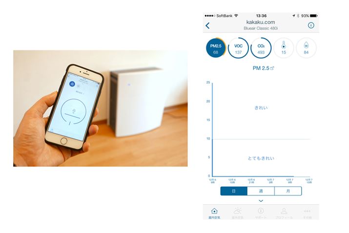 スマホと連携したコントロールが可能になり、便利さがグンとアップ。アプリでは空気の状態を「1日」「週」「月」単位のグラフでも表示でき、現在の空気の状態を相対的に把握することができるので、空気清浄対策が必要かどうかの判断もしやすい。