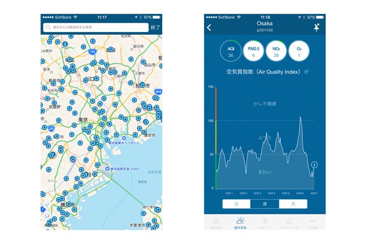 最寄りの観測点はアプリで簡単に選択可能。右は筆者宅最寄りの観測点データで、AQIの変化も一目瞭然。たとえば、室内のPM2.5が多くて外気がキレイな状態の場合、空気清浄機をフル運転するよりも、窓を開けて換気したほうがスピーディーなケースもあるに違いない。「情報」を駆使した賢い使い方に応えてくれる仕様だ。