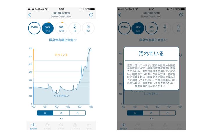 アプリではVOCのグラフを表示でき、1日の変化も一目瞭然。グラフ上の(i)マークをタップすると、空気の状態と対策方法を知ることもできる