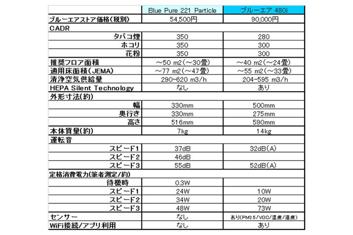 今回の比較検証では、Blue by Blueairシリーズから、ダストフィルター搭載のBlue Pure 221 Particleを選択。Blueair Classicシリーズからは、空気清浄能力が3モデルの中でもっともBlue Pure 221 Particleに近い「480i」を選んで試用してみた。ここからは、「基本性能/スペック」「デザイン」「魅力」の3点から2シリーズの比較に入る。