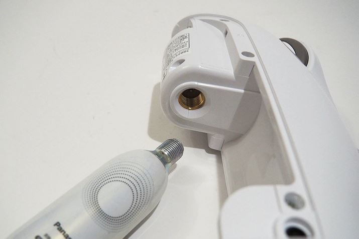 「EH-SG90」と専用の炭酸ガスカートリッジ。本体サイズは11.7(幅)×16(奥行)×27.5(高さ)cmで、2Lのペットボトルに近いサイズ。重量は約850gです