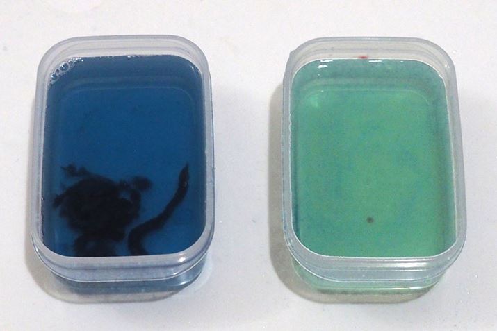 炭酸水は弱酸性なので、炭酸濃度が濃いほどアルカリ水の色が変化します。左の容器には炭酸パック(クリーム状)を投入。いっぽう、右の容器には「EH-SG90」で5秒だけ炭酸ガスを発生させたところ、一瞬にして容器の水の色が変化しました! 炭酸パックに比べて、「EH-SG90」から発生する炭酸の濃度がかなり高いことがわかります