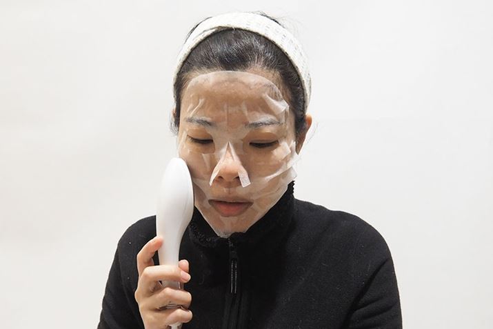「EH-SG90」には、「イオン(保湿)」モードという機能もあります。炭酸モードは基本的に水だけで行うため、終了後はケアをする必要があります。ちなみに、イオンモードでは手持ちの化粧水や化粧成分を含むシートマスクが使用可能。使い方は簡単で、モード選択で「イオン(保湿)」を選択し、シートマスクの上からパターを当てるだけ。電気浸透流により、保湿成分がより角質層に浸透しやすくなるそうです。
