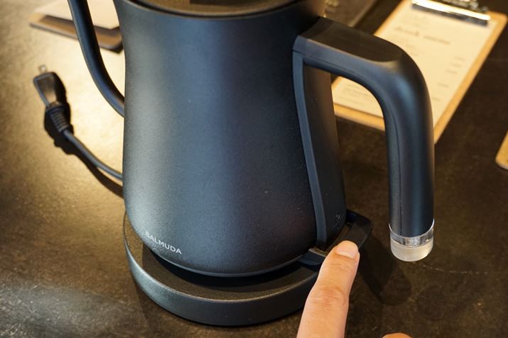 湯沸かしのスイッチは本体下部に搭載されています。スイッチがハンドルの付け根あたりに装備されている電気ケトルが多いですが、「BALMUDA The Pot」の位置のほうが押しやすいと感じました