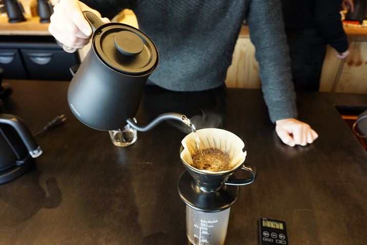 「BALMUDA The Pot」のこだわりを聞いたあとは、ハンドドリップに挑戦! プロのお手本を見てから、同じようにやってみます。レクチャーしてくれた東京・原宿にあるカフェ「artless craft tea & café」のバリスタの手法は、200mlを3分かけて抽出するというものでした。