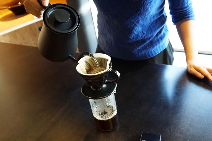 熱湯をドリッパーに注いで温めた後、フィルターを設置してコーヒー粉をセット。コーヒー粉全体にお湯がかかるように注ぎ、30秒蒸らします。もっともコーヒーの味を左右するのは、最初にコーヒー粉にお湯を注いで蒸らす、この工程だそう