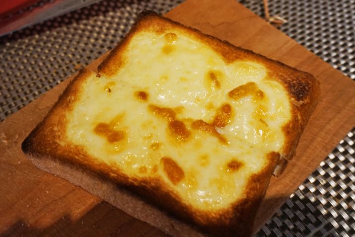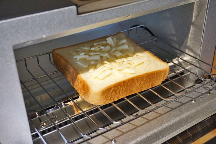 今回トーストしたのは、チーズを乗せた食パン。一般的なトースターは乾燥してチーズが縮むことから縁までめいっぱいチーズを乗せてしまいがちですが、「BALMUDA The Toaster」はスチームでチーズもふっくらとするため余白を残すのがミソです