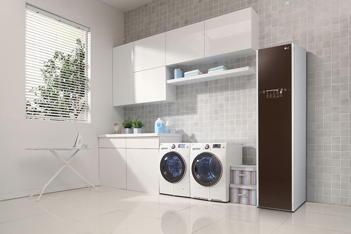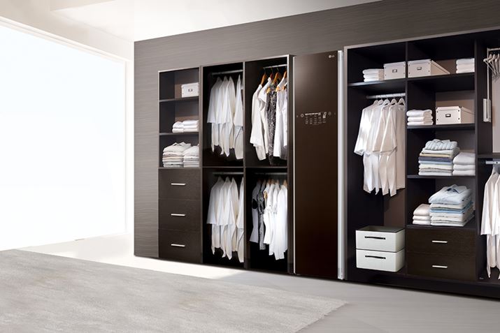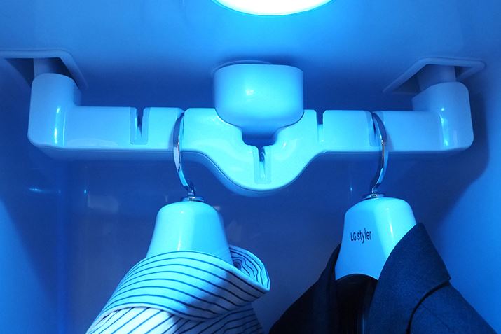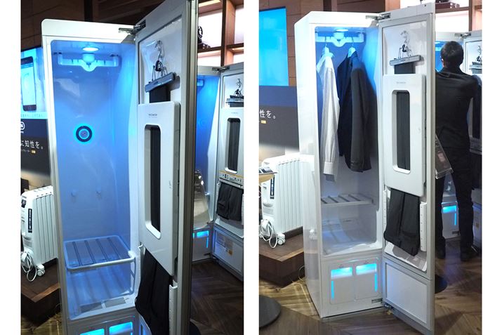 また、もうひとつの特徴はロッカーのような据え置き型のデザイン。従来までの衣類脱臭・除菌可能製品は、空気清浄機のように移動させられる程度の大きさの製品が多かった。しかし、LG Stylerは445(幅)×1,850(高さ)×585(奥行)mmと、背の高いロッカーほどのサイズで、洗濯機や冷蔵庫のように室内に設置して使う。このため、服をタンスにしまうみたいに、手軽にホームクリーニングができるとアピールしている。